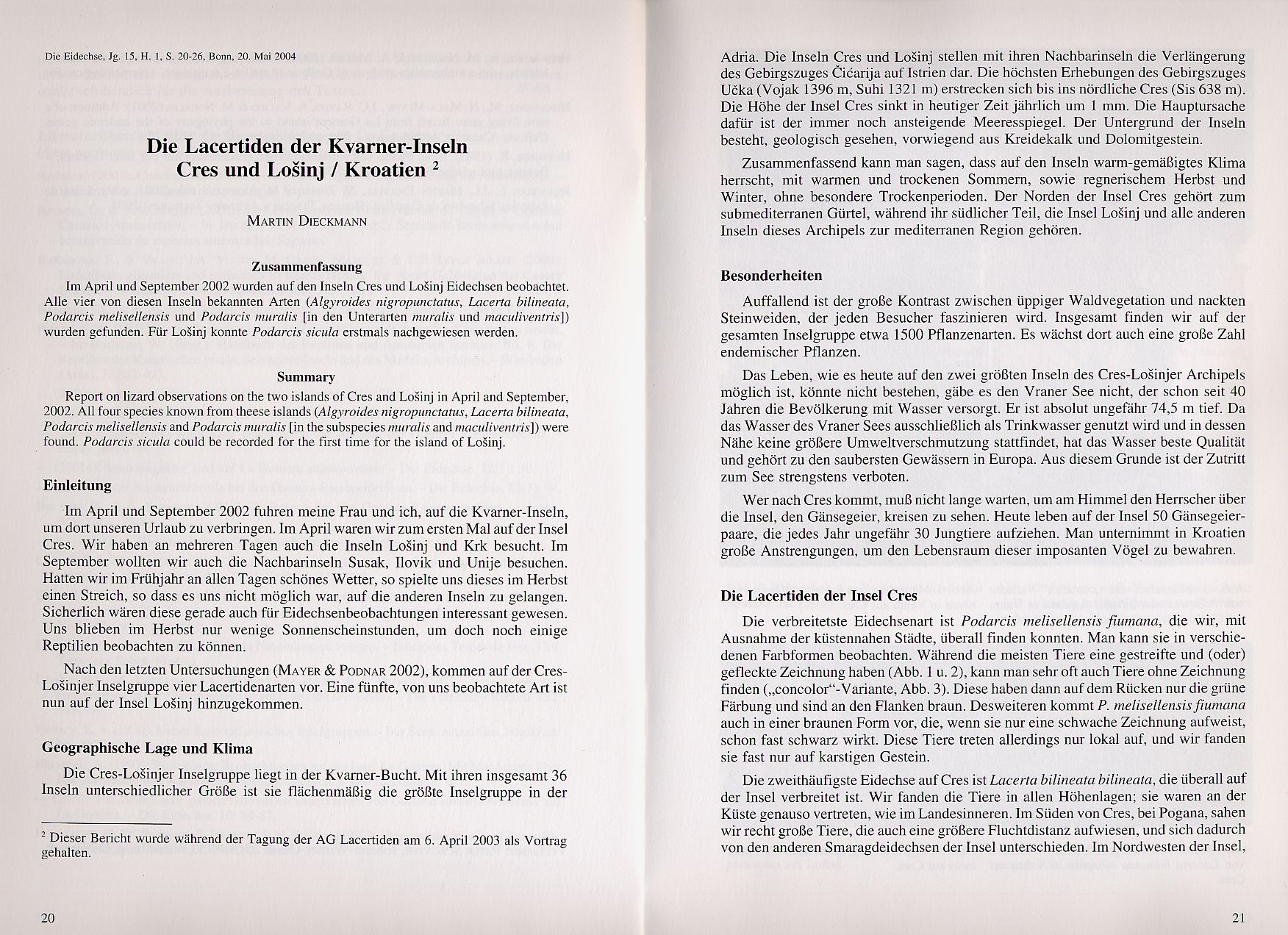 In Heft 1/2004 der Eidechse findet sich auf den Seiten 20-26 ein Beitrag von Martin Dieckmann mit dem Titel "Die Lacertiden der Kvarner Inseln Cres und Losinj / Kroatien". Der Artikel widmet sich in einer wissenschaftlichen Betrachtungsweise den Eidechsenvorkommen auf Cres und Losinj. Dabei werden sowohl Vorkommen als auch Aussehen (Färbung und Zeichnung) und Verhalten der Tiere beschrieben und analysiert. Auf den Seiten 22-23 finden sich Bilder der beobachteten Eidechsen mit entsprechender Beschreibung. Alle Texte und Bilder des Artikels unterliegen dem Urheberrecht des Autors Martin Dieckmann |